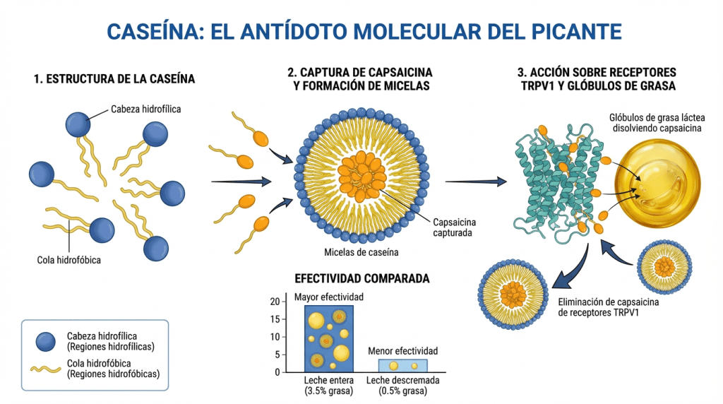 Este “secuestro molecular” tiene dos efectos: primero, la caseína compite con TRPV1 por la capsaicina, reduciendo la cantidad disponible para activar receptores [27]; segundo, los complejos caseína-capsaicina son solubles en saliva y pueden tragarse, removiendo físicamente el irritante [28].