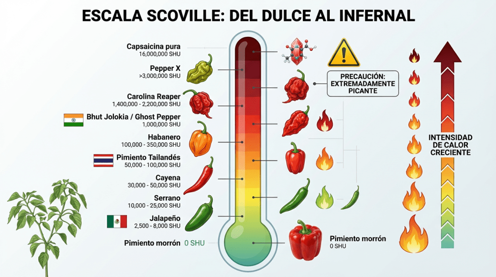 La escala Scoville, desarrollada en 1912 por el farmacéutico Wilbur Scoville, cuantifica el picante mediante Unidades de Calor Scoville (SHU) [1]. Originalmente, extractos de chile se diluían en agua azucarada hasta que el picante dejaba de detectarse [26]. Un pimiento que requería dilución 1:1000 tenía 1000 SHU. Hoy, cromatografía líquida (HPLC) mide directamente la concentración de capsaicinoides, convirtiendo partes por millón a SHU mediante: SHU = ppm de capsaicina × 15-16 [26]. Las diferencias reflejan variaciones genéticas en biosíntesis de capsaicinoides, moduladas por temperatura, estrés hídrico y disponibilidad de nitrógeno [16].
